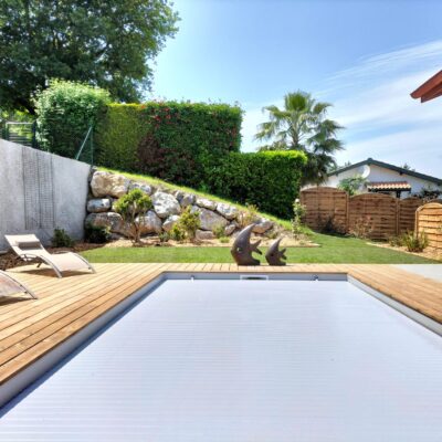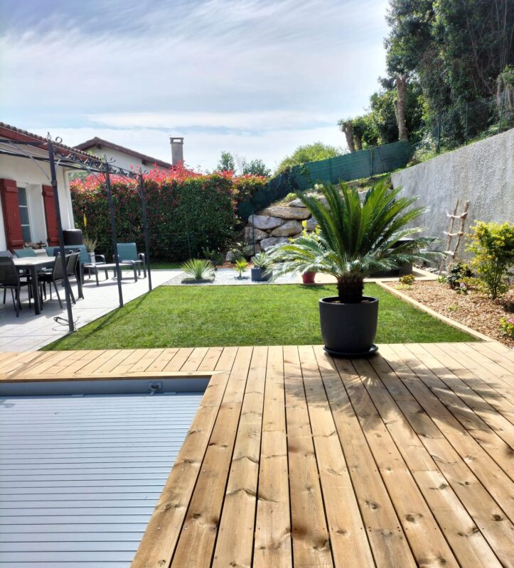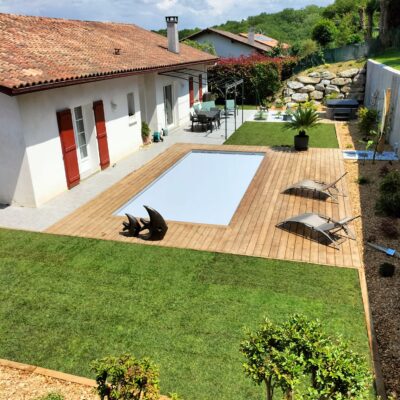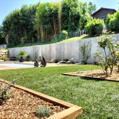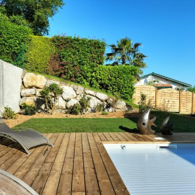 Nous avons participé à la réalisation de la piscine et l’aménagement paysager pour notre client. Des bordures en bois assorties à la terrasse ont été posées pour structurer les abords et renforcer l’harmonie de l’ensemble. Enfin, nous avons procédé à la mise en place d’un gazon en plaques, pour un rendu immédiat et une finition soignée.