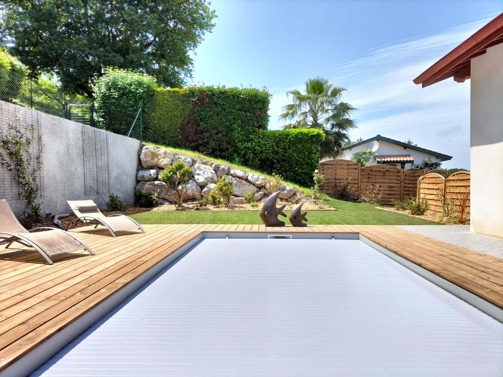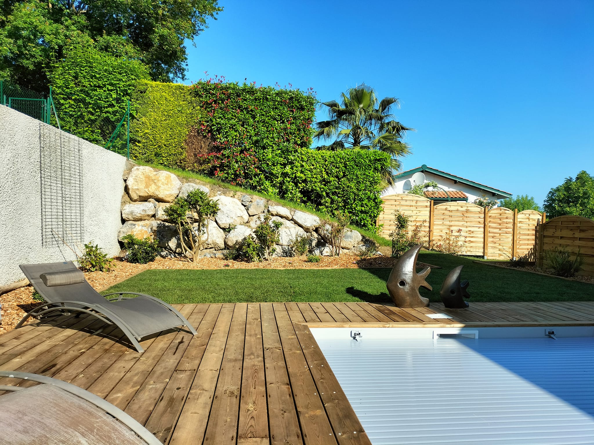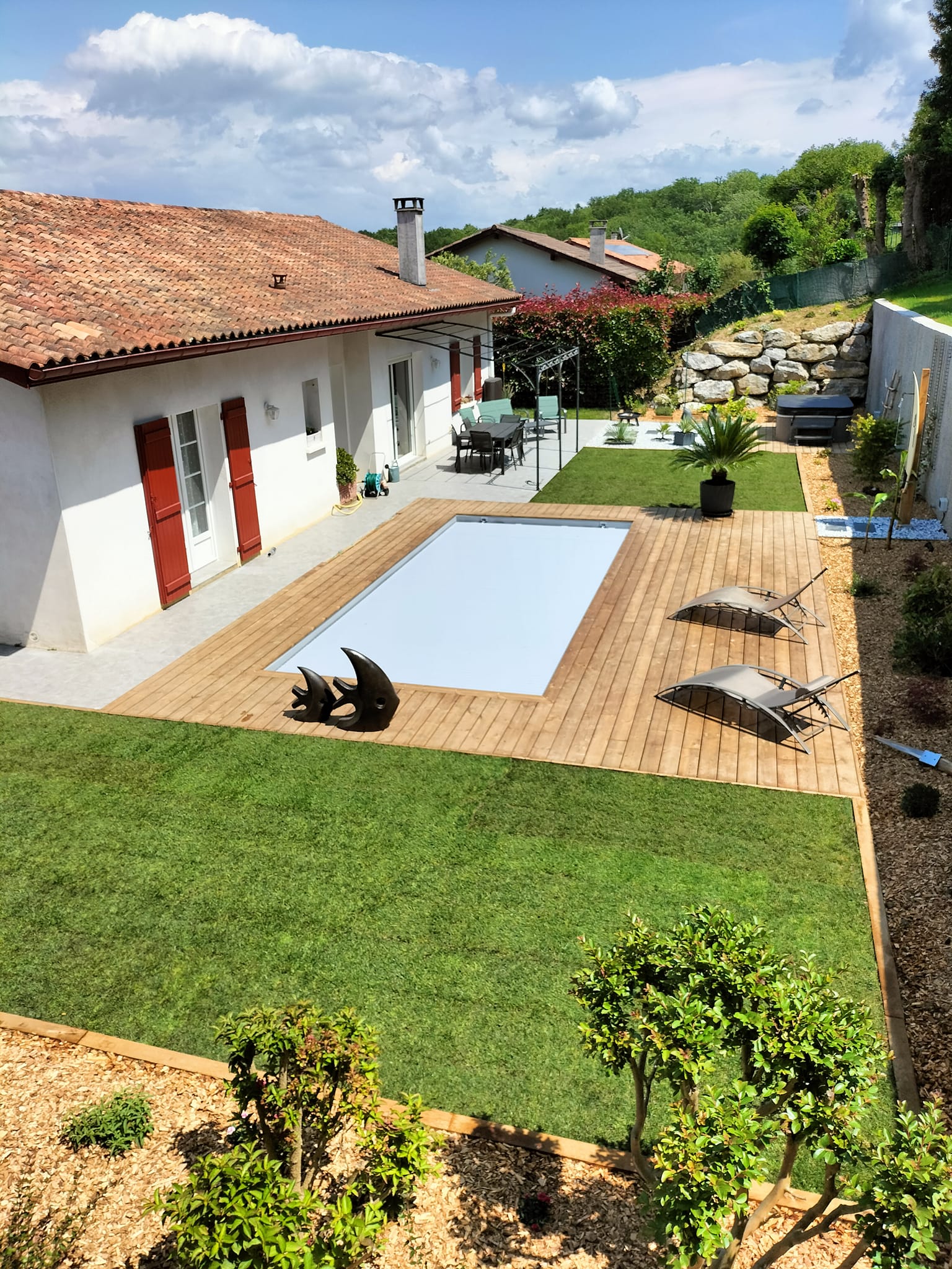 Nous avons participé à la réalisation de la piscine et l’aménagement paysager pour notre client. Des bordures en bois assorties à la terrasse ont été posées pour structurer les abords et renforcer l’harmonie de l’ensemble. Enfin, nous avons procédé à la mise en place d’un gazon en plaques, pour un rendu immédiat et une finition soignée.